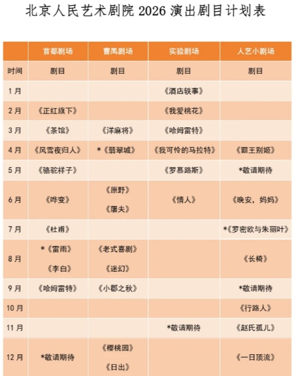 立足人艺剧场群落打造多元演出格局 该表格按首演日期排列,个别剧目跨自然月具体演出日期以实际演出情况为准2026年,北京人艺的五座剧场将继续敞开大门,共同为观众呈现多元并存、层次丰富的演出格局。首都剧场、曹禺剧场、实验剧场及人艺小剧场将依据各自鲜明的定位,奉献风格多样的舞台艺术精品。经典剧目与原创作品并重,守正与创新并行,写实与写意交织,满足不同观众群体的多样化审美需求。与此同时,菊隐剧场将持续发挥其独特的公益职能,为群众戏剧提供展演平台,让更多戏剧爱好者的热爱在专业艺术殿堂绽放光彩。首都剧场经典新篇交错上演2026年的首都剧场将依然佳作云集,古今中外名作连台,经典剧目与新排剧目交错上演,在守正创新中展示出经典的蓬勃生命力。由冯远征、闫锐联合执导的《正红旗下》将率先登台,拉开首都剧场新年演出大幕。自2023年1月首演至今,这部承载北京人艺传承与创新双重使命的大戏已经演出七十余场。本轮演出是该剧第三次陪伴观众共度新春佳节,共同感受老舍先生笔下的大爱与悲悯,以及对人性、家庭与民族的深刻思考。3月,老舍先生的另一部剧作,北京人艺的“镇院之宝”《茶馆》将再度上演。这部中国话剧史上的里程碑式的作品,凭借深刻的时代洞察、鲜活的人物群像与厚重的文化底蕴,《茶馆》在一代代演员的传承中,持续向观众传递历久弥新的艺术生命力与思想深度。4-5月,去年推出的“经典保留剧目恢复计划”前两部作品,将接连登台与观众见面。由闫锐导演的《风雪夜归人》于五一档期上演,以唯美的场景和当代的表达,再度为观众带来富含东方意蕴的新中式舞台审美体验。之后,由闫锐、于震担任复排导演的《骆驼祥子》以原汁原味的舞台“复刻”,让观众回望那段历史,展现北京人艺青年一代传承经典的诚意与实力。6月,任鸣导演的外国经典《哗变》将再次“开庭”,这部代表“话剧姓话”的教科书式作品依然会以密集的台词“风暴”席卷全场,为观众呈现一场酣畅淋漓的“法庭”对决,同时迎来该版本的百场演出里程碑。7月,冯远征导演的历史剧《杜甫》再度上演,凭借美轮美奂的写意舞美,舞台上下将继续在“画中走、诗中游”的独特意境中,与观众相约“诗之江湖”。8月,诗圣之后,诗仙归来。由苏民、唐烨导演的《李白》,以大写意的舞台呈现,让诗酒趁年华的洒脱与心怀天下的赤诚相互交织,尽显中国文人的风骨气韵与中华文化的深厚底蕴。9月底,冯远征、杨佳音导演的新排版《哈姆雷特》将开启二轮演出。该剧以“选择”为核心解读经典,以当代审美探索古典悲剧的现代表达,在多元舞台呈现中,与观众共同完成对莎翁经典的深度探寻。曹禺剧场传统前沿相互碰撞 北京国际戏剧中心·曹禺剧场继续保持开阔的艺术视野,致力于呈现兼具传统底蕴与现代特质的戏剧作品。新的一年,观众在这里既能领略经典文本的当代演绎,也能感受前沿戏剧的艺术冲击。3月底,唐烨导演的外国经典剧作《洋麻将》将再度登台。全剧聚焦两位老人的14把扑克牌局,每一把牌都深刻揭示人物的心理性格与生存境遇,暮年困顿与温情微光极致交织,令人于唏嘘中生出强烈共情。6月,闫锐导演的《原野》将在曹禺剧场开启第五轮演出。该剧既有对原著精神内核的坚守,又有贴合当代观众审美的创新表达,以大胆的创作手法,极具民族特色的审美样式,呈现出“不一样的‘原野’”。随后,何冰导演的《屠夫》将迎来二轮演出。该剧聚焦世界反法西斯主题,用细腻笔触勾勒时代洪流中的个体命运,创造性地将火车头完整搬上舞台,借助极具冲击力的视觉呈现,让战争的残酷直抵人心。班赞导演的《老式喜剧》将继续与观众相约“为八月干杯”。本剧以细腻温润的叙事,勾勒出两个灵魂在岁月沉淀中碰撞出的“生命之光与爱情之火”,也将在本轮迎来百场演出。8月末,徐昂导演的“两个人的大戏”《迷幻》以独树一帜的舞台叙事手法与直抵灵魂的深刻哲学追问,向观众发出诚挚邀约,共赴一场兼具悬念张力、反转惊喜与深层哲思的沉浸式解谜之旅。9月下旬,唐烨和龚丽君导演的《小郡之秋》将携超高人气二度登台,凭借强大的演出阵容、扎实的现实主义表演,带领观众深度走进一个美国家庭的情感漩涡,体验亲情、爱情与人性的起伏纠葛。12月初,跨年新作、大卫·多伊阿什维利导演的《樱桃园》将开启二轮演出。该剧以丰富的艺术表达、丰满的人物塑造、充满隐喻的舞台设计,为中国观众解读契诃夫经典提供了全新视角。当时光流转至2026年末,跨年氛围再次渐浓之际,冯远征导演执导的经典剧目《日出》将温情登场,深耕曹禺原著精髓的同时,让人物焕发出年轻化的鲜活质感,以舞台之光陪伴观众奔赴新岁。小剧场青春创意共同绽放 北京人艺的小剧场话剧始终以实验性与先锋性为导向,持续推出鲜活新颖、极具探索精神的戏剧作品。新一年,小剧场将继续释放青春活力与探索创意,为观众呈现一系列特色鲜明的演出。北京人艺实验剧场——1月,朱少鹏导演的《酒店轶事》将开启第三轮演出,于生活化场景中挖掘幽默内核,以真诚欢乐的氛围打动人心。2月,任鸣导演的小剧场经典《我爱桃花》再度演绎今人眼中的唐传奇,让“刀还是巾帻”所引发的跨越时空争执更具思辨性与艺术感染力。3月,杨佳音导演的《哈